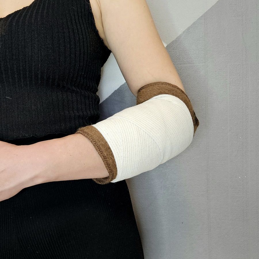Фиксирующая шерстяная повязка отличается от аналогичных изделий конструкцией. Она состоит из двух частей – согревающего полотна и удерживающего эластичного бинта. Такая система закрывает весь сустав, при этом его можно запросто спрятать даже под офисный наряд или легкую одежду.