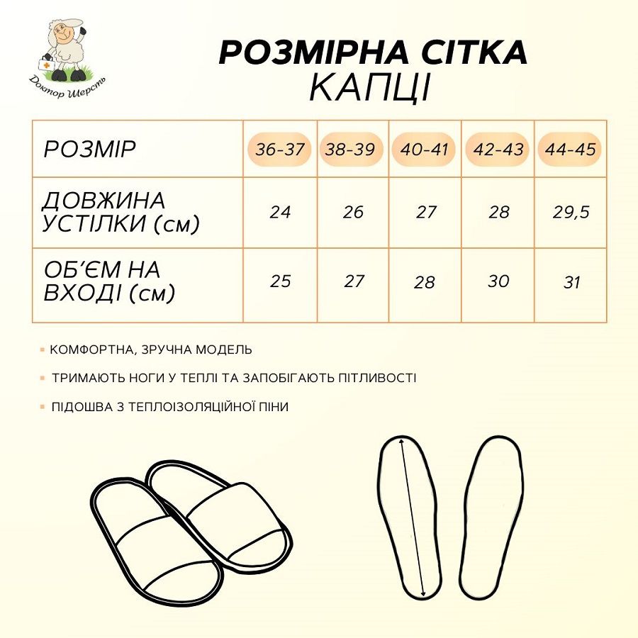 Всі матеріали, задіяні у виробництві, якісні і зносостійкі. Тобто, куплені у ТМ «Доктор Шерсть» капці прослужать довгу службу.
